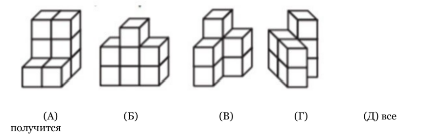 Решение: Даны кусочки по 3 и 4 кубика. В каждой детали 7 кубиков, значит, слева внизу у детали A «дырка», и везде надо использовать левую верхнюю деталь (7=3+4). Используя по две из них, можно составить любую из нарисованных деталей. Кусочки можно поворачивать. (A) левый нижний + левый верхний; (Б) два верхних; (В) левый верхний + правый нижний; (Г) два верхних.