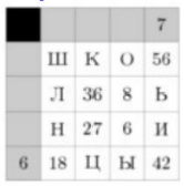 Решение: Пользуясь известными ответами в таблице умножения, восстановим: в верхней строке серые клетки 3,9,2,7; в левом столбце 8,4,3,6. Далее Л=4*3=12, 6*2=12=Ы.