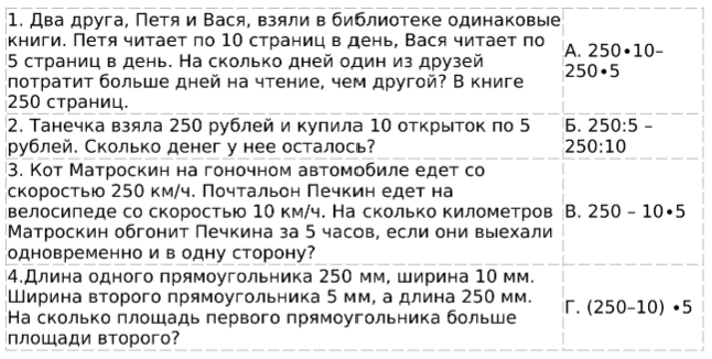 Решение: 1) Вася по 10 страниц в день прочтёт книгу за $250:10$ дней, Петя за $250:5$ дней. Разность показывает, сколько дней больше. 2) Таня потратит на 10 открыток по 5~руб $10\cdot5$~руб, а сдача $250-10\cdot5$. 3) Скорость удаления Матроскина от Печкина равна разности скоростей $250-10$, за 5~ч обгонит на $(250-10)\cdot5$. 4) Площадь прямоугольника – произведение сторон; разность $250\cdot10-250:5$.