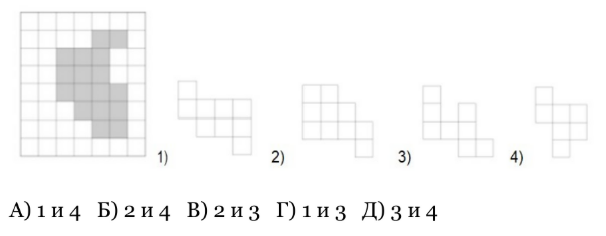 - В прямоугольнике на клетчатой бумаге закрасили несколько клеток. Укажите, из каких деталей, нарисованных на рисунках (1)--(4), можно сложить закрашенную область?