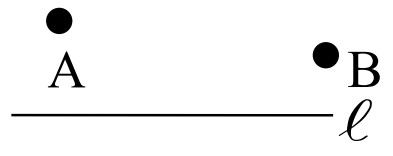 - На прямой \(\ell\) найти точку \(C\), чтобы сумма расстояний \(AC + BC\) была наименьшей.