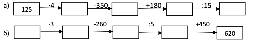 $ \text{a)} 125 \xrightarrow{\cdot 4} \boxed{500} \xrightarrow{-350} \boxed{150} \xrightarrow{+180} \boxed{330} \xrightarrow{:15} \boxed{22} $ $ \text{б)} \boxed{370} \xrightarrow{\cdot 3} \boxed{1110} \xrightarrow{-260} \boxed{850} \xrightarrow{:5} \boxed{170} \xrightarrow{+450} 620 $ $ \text{Проверка (б)}:\quad \frac{3x-260}{5}+450=620 \;\Rightarrow\; 3x-260=850 \;\Rightarrow\; 3x=1110 \;\Rightarrow\; x=\boxed{370}. $ - Вычислите: