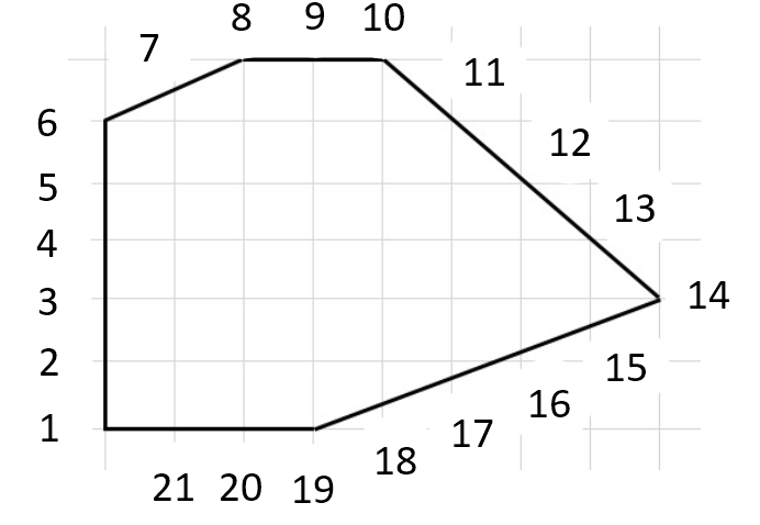 - Разрежьте фигуру одним прямолинейным разрезом на две части равной площади. В ответе укажите номера двух точек, через которые пройдёт разрез.