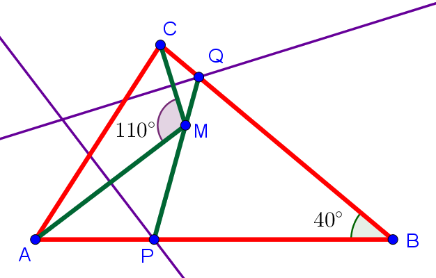Задача 5 Внутри треугольника $ABC$ ($\angle ABC=40^\circ$) взята точка $M$ так, что $\angle AMC=110^\circ$. Серединные перпендикуляры к $AM$ и $MC$ пересекают $AB$ и $BC$ в точках $P$ и $Q$. Докажите, что $P,Q,M$ коллинеарны.