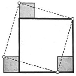 - Решение: Пусть три меньших равных квадрата имеют сторону размером \( a \), а большой квадрат — \( b \). Пунктирная фигура образуется пересечением границ квадратов. Учитывая симметрию и углы в \( 90^\circ \), объединение равных малых квадратов и их расположение относительно наибольшего квадрата образует новый квадрат за счет равных сторон и прямых углов. Таким образом, пунктирная фигура является квадратом вследствие равенства всех внутренних углов и сторон.