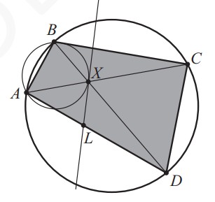 - Дан вписанный четырёхугольник \(ABCD\). Его диагонали пересекаются в точке \(X\). Вокруг треугольника \(ABX\) описали окружность. Через точку \(X\) провели касательную к этой окружности, которая пересекает \(AD\) в точке \(L\). Найдите сумму углов \(LXC\) и \(XCD\), если \(\angle ABD = 55^\circ\), \(\angle BAC = 44^\circ\).