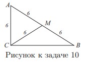 - (2 балла) В прямоугольном треугольнике $ABC$ медиана $CM=6$ делит прямой угол $C$ в отношении $1:2$. Найти $\sqrt3\cdot S_{ABC}$.