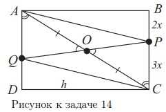 - (6 баллов) В прямоугольнике $ABCD$ через середину $AC$ провели прямую, пересекающую $BC$ в $P$ и $AD$ в $Q$ при $BP:PC=2:3$. Определить вид $APCQ$ и найти его площадь, если $S_{ABCD}=20$.